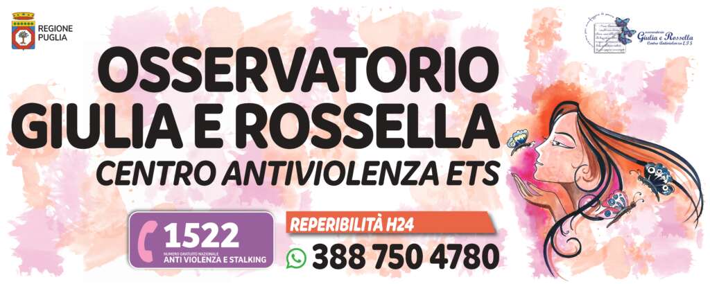 L’Osservatorio Giulia e Rossella, centro antiviolenza autorizzato dalla Regione Puglia, accoglie le donne nella sua sede autonoma di Barletta in Via d’Aragona n.143 e nella sede di Piazza Aldo Moro n. 16, dove gestisce il Centro Antiviolenza Comunale Saman Abbas.